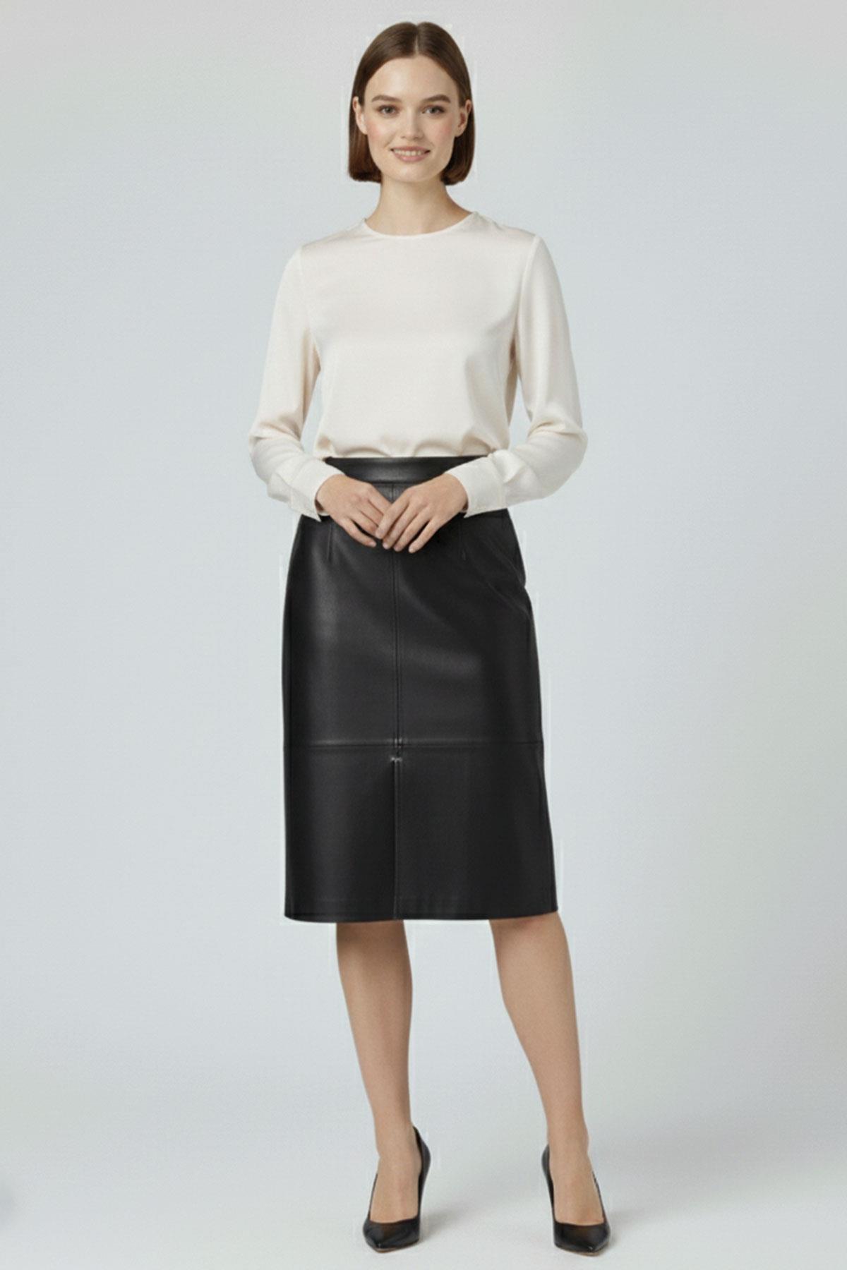 Black Lina Midi Genuine Leather Women's Skirt with Slit Detail