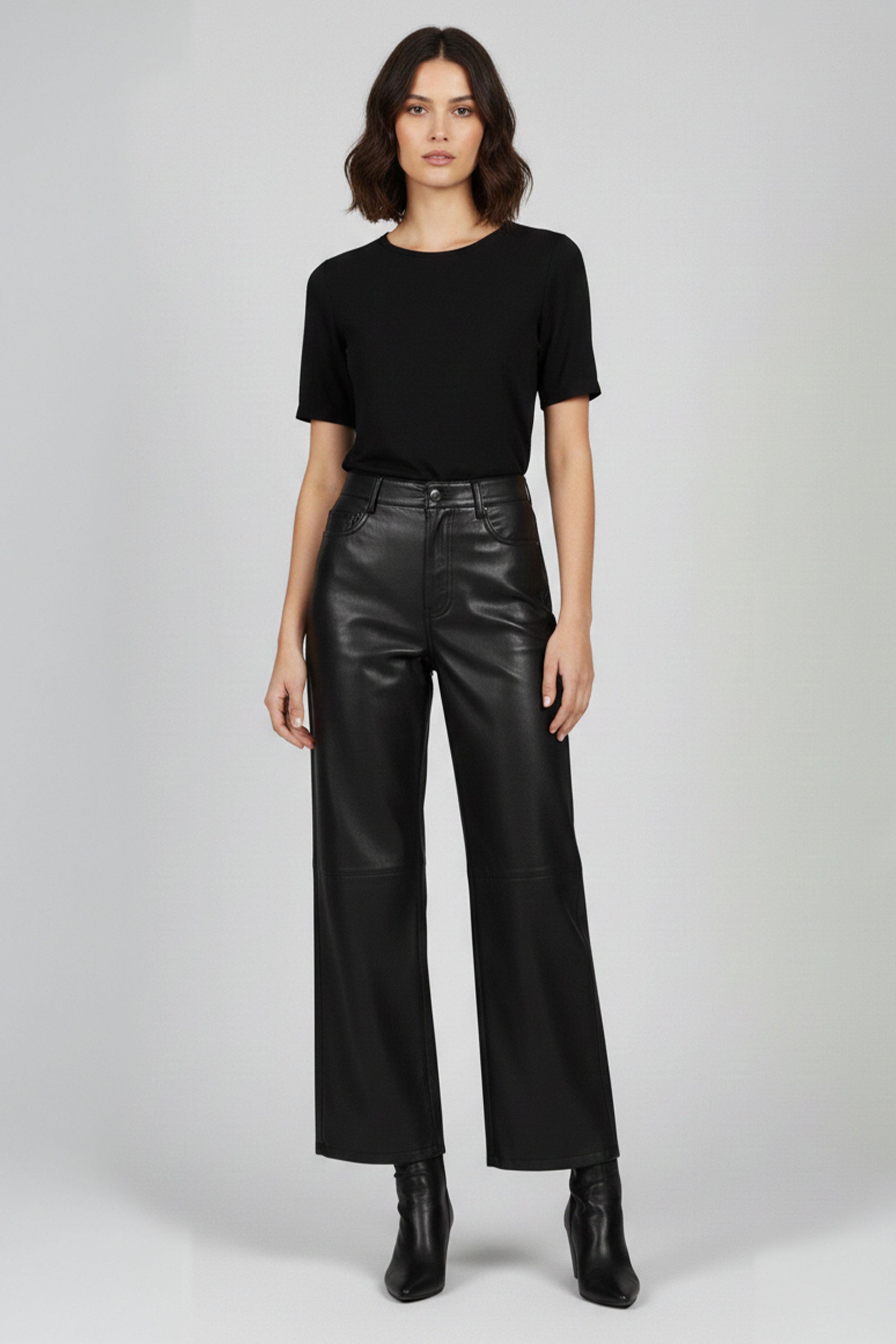Black Nora Genuine Leather Wide Leg Women's Trousers