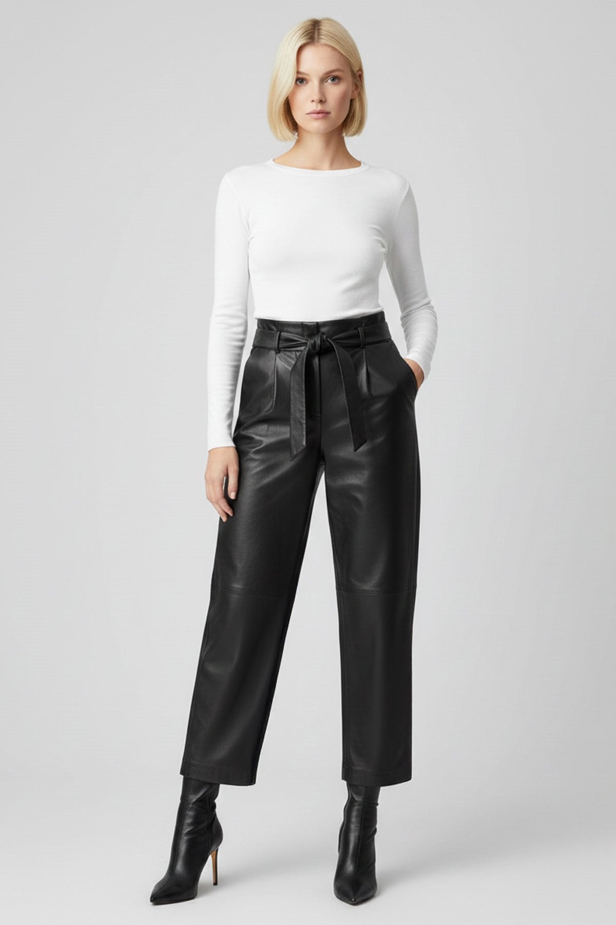 Black Women's Carrot Cut Belted Lined Genuine Leather Pants with Front Pockets