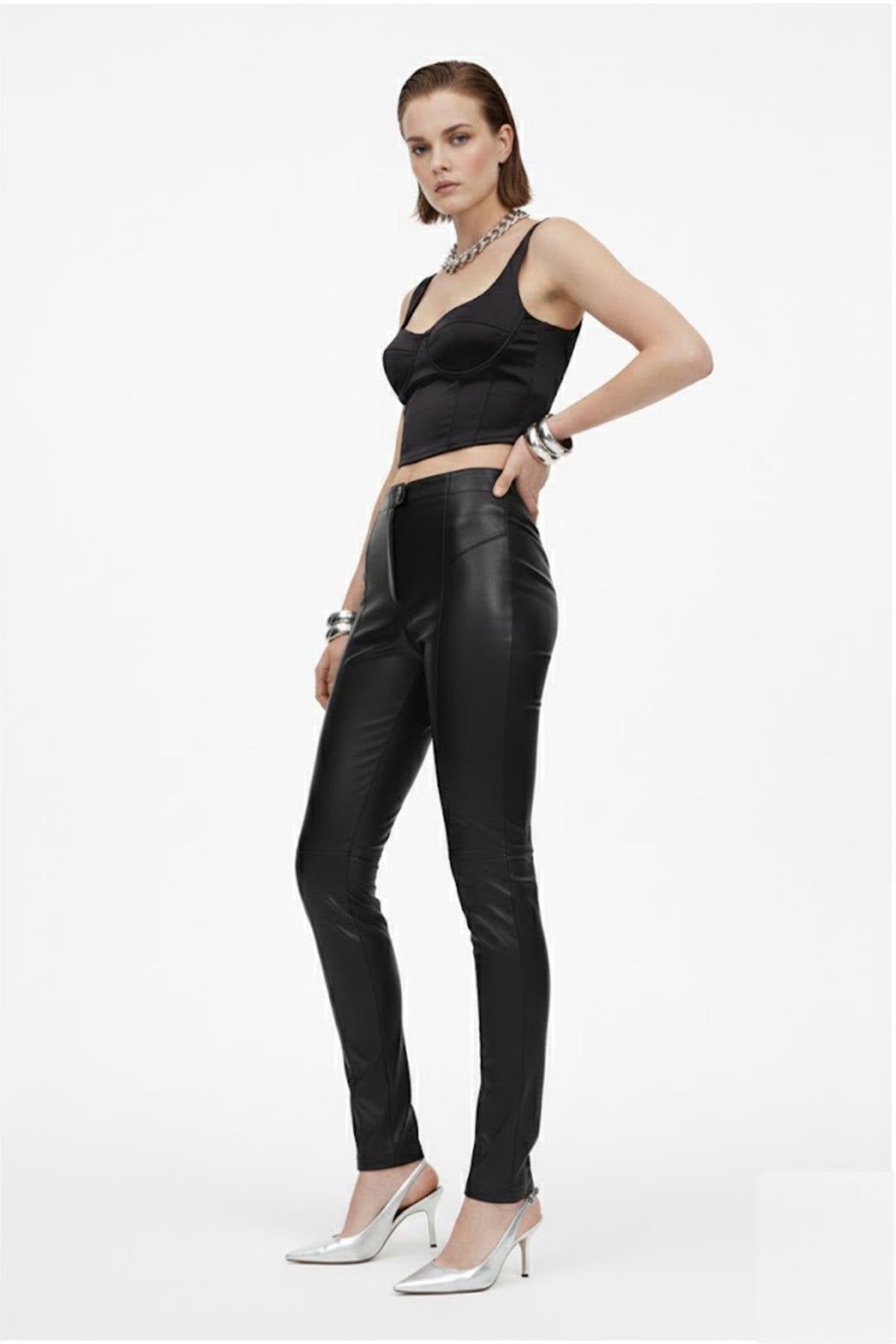 Black Women's Leggings, Unlined, Front Zipper and Button Closure, No Pockets, Slim Fit, Genuine Stretch Leather Pants